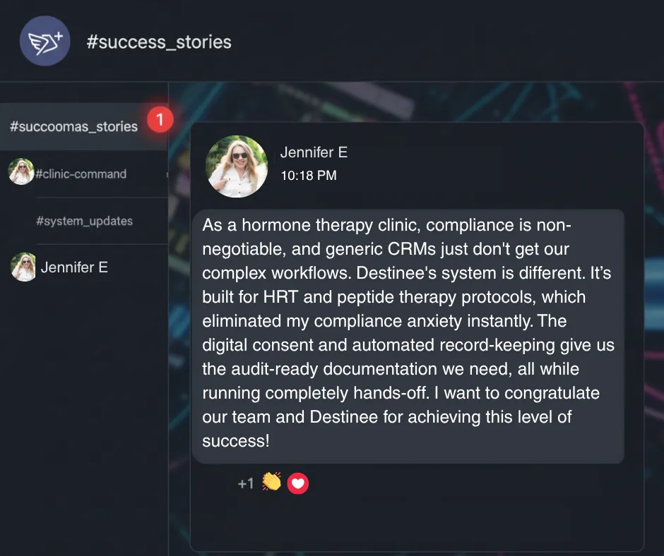 Unlike generic practice management consultants who give theoretical advice, Destinee personally builds and installs every system. She understands the unique challenges of hormone therapy patients the nervousness, the questions, the preparation requirements and has engineered specific solutions for each challenge.